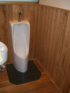 会社のトイレをリフォームし、自社で扱っている山武スギの床材、壁材を張りました。壁は天井まで張るとサウナのようになってしまうので腰高までにして、その上は化学物質を出さない健康壁紙にしました。もちろん羽目板は無塗装で、低温乾燥させた山武スギの油分だけで美しい艶が楽しめます。床のフローリングはさすがに国産の天然塗料を塗り、ある程度の撥水性を確保しました。