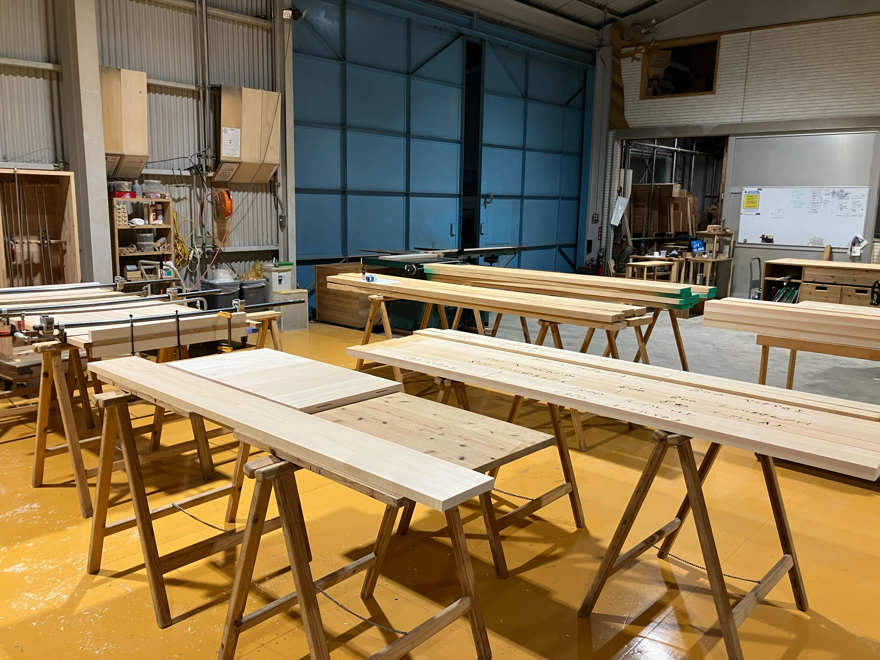 現在、工房ではお客様からの依頼でテーブルとベンチの試作をしています。
