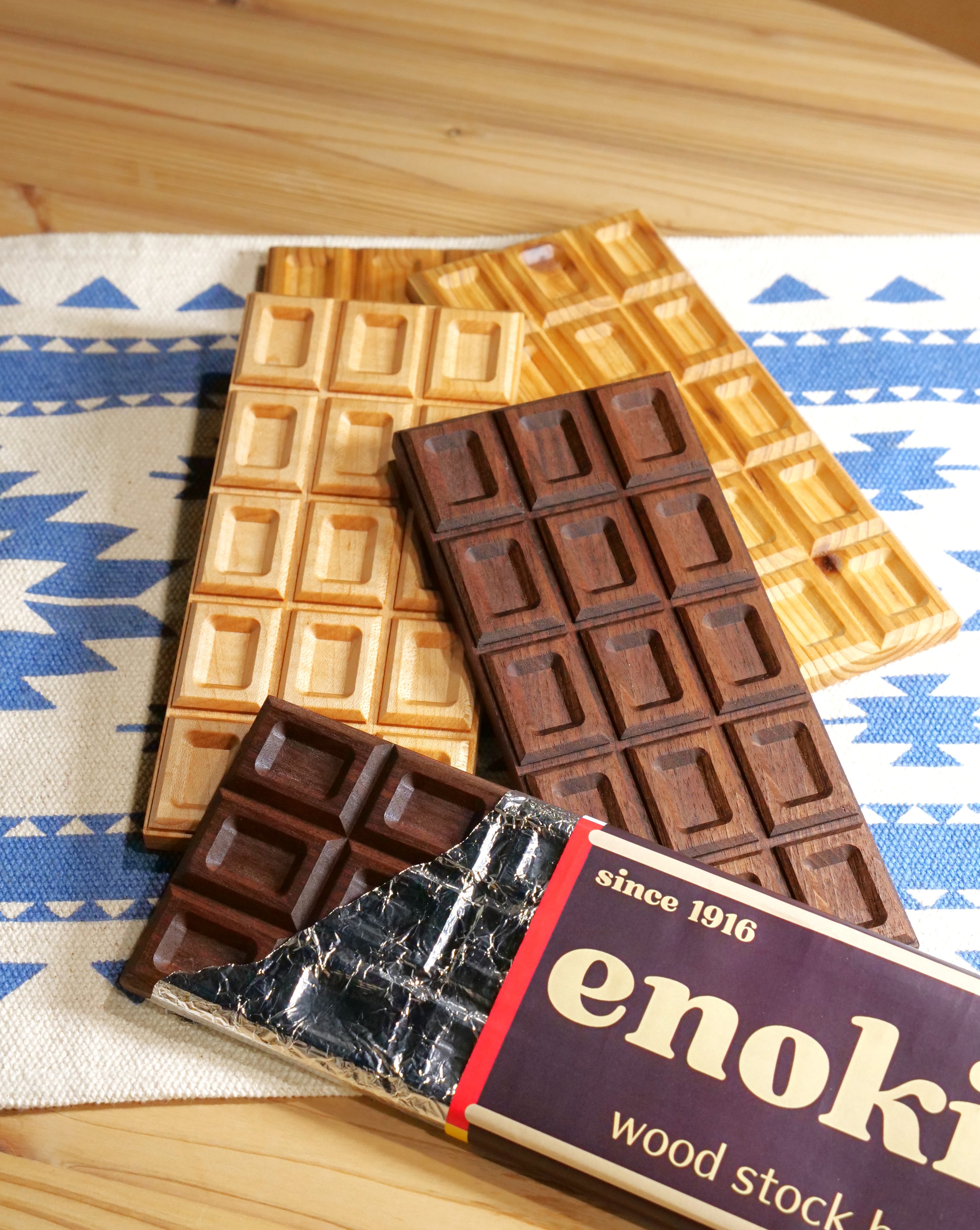 老舗の材木屋が、木そのものの質感と色味を活かし、本物のチョコレートそっくりに仕立てました。